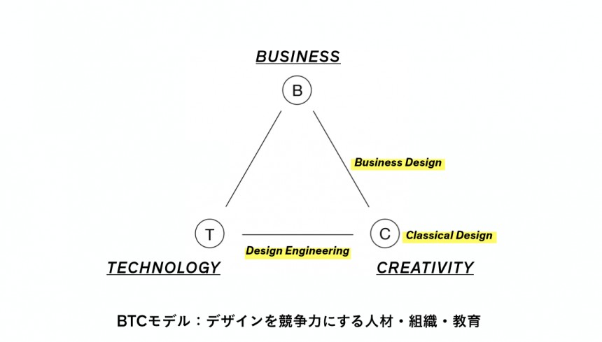 Cを軸に、必要となるデザイン人材は3種類。C専門のクラシカルデザイン(C)、BとCの間をつなぐビジネスデザイン(BC)、TとCの間をつなぐデザインエンジニアリング(TC)を担える人材である。これはBTCをトライアングルで表すと理解しやすい。BTCの各専門家に加え、それぞれをつなぐハイブリッド人材がいることで、3領域を完全分業ではなく統合させて新しいものを生み出すことができるようになるのだ。