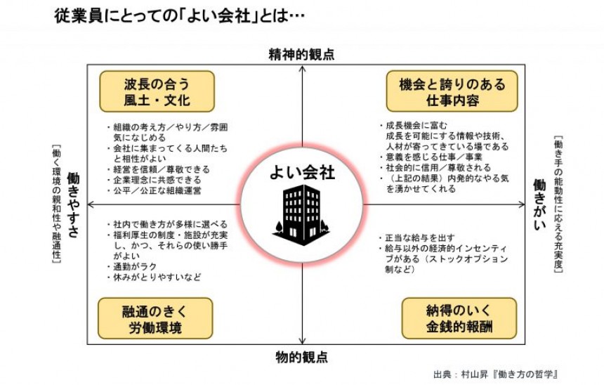 下は私が自著の中でまとめた「従業員にとっての『よい会社』とは」の図です。働き方改革で実行されてきた時短や有給休暇取得などの義務化・奨励化は、主にこの4象限図の左下です。すなわち、「物的×働きやすさ」の施策です。