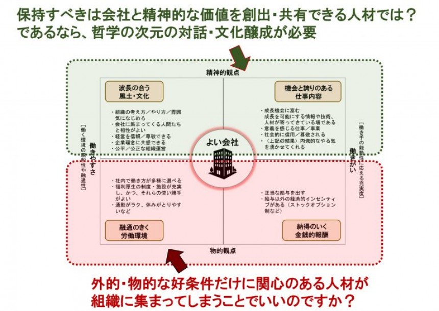 働き方改革が叫ばれる昨今、さらには人手不足の昨今、企業は物的にいろいろなものを拡充させてヒトを呼び寄せ、囲い込もうとします。それによって短期的には効果が出るかもしれません。しかし、それと同時に従業員を巻き込んだ精神的な取り組み――例えば、事業理念の共有やこの会社で働くことの意味創出などを喚起する対話――をせずに、内発的動機を空洞にさせたまま数値目標達成に向かって突っ走るとどうなるでしょう……。