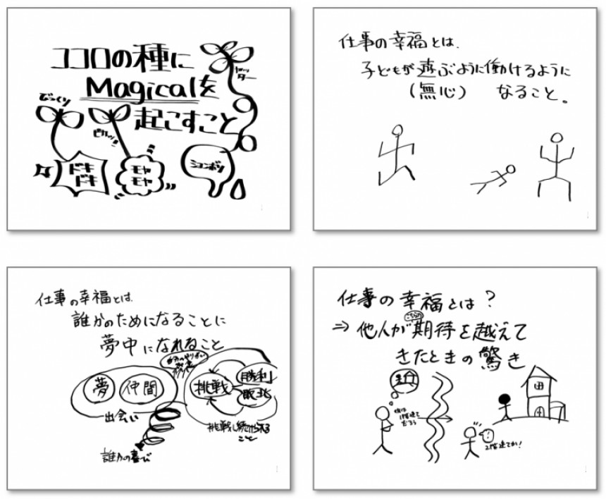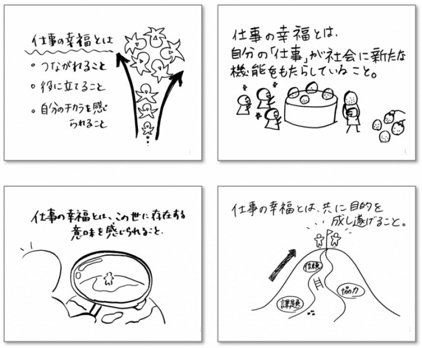 例えば、下の手書きシートは、私が「健やかな仕事観をつくるワークショップ」で行った内省ワークの答案の数々です。参加者には「仕事の幸福(あるいは、働くことの喜び)とは何かをA4用紙1枚に表現してください」とだけ問いました。