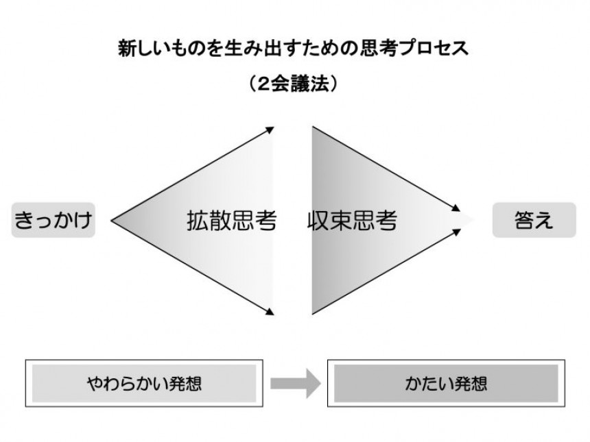 一方、僕が重要視しているのは「それっておもしろい?」「どんなことをイメージしているの?」といったこと。バーンと広がっていくイメージであり、その両方が大事になるという話です。いずれにしても、イノベーションを起こすプロセスでは、いきなり収束させてしまうとだいたい同じような帰結になってしまうから、まずは思考を広げて混ぜるということを私は推奨しています。