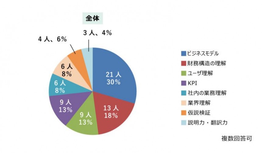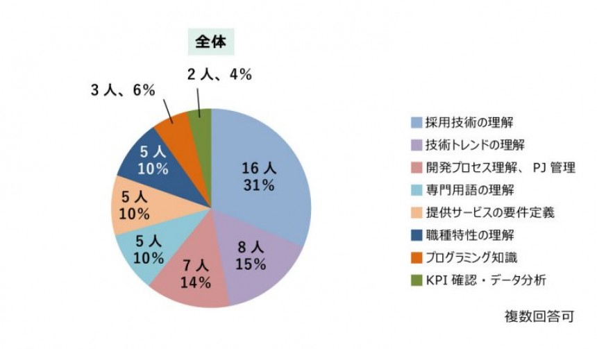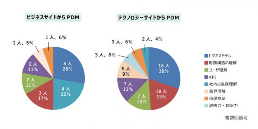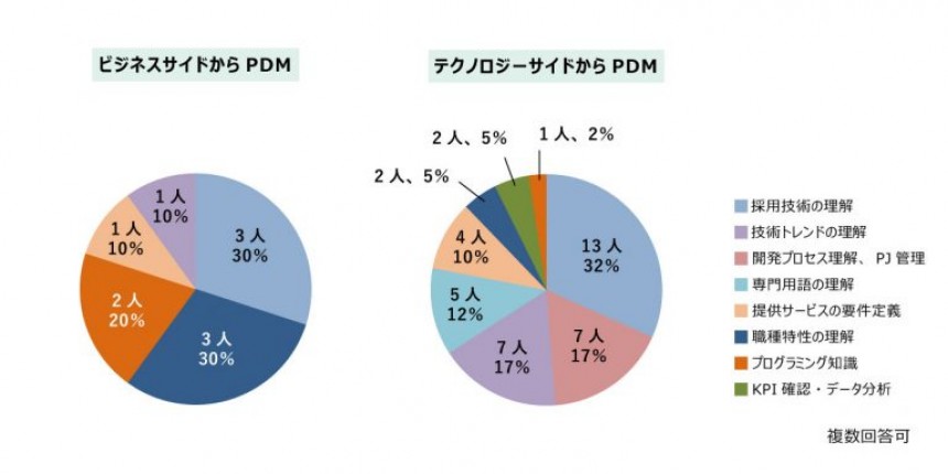 「ビジネスサイドからPDM」の方は、「職種特性の理解」と「プログラミング知識」を必要とする回答が多かった。これまでエンジニアやプログラミングとの接点が少なかったビジネスサイドの人にとって、まずは、エンジニアという職種の理解やプログラミング知識を得ることが必要だと考えているのだろう。