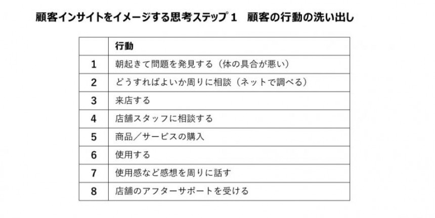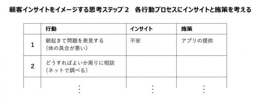 次に、書きだした顧客行動プロセスごとに、顧客の感じているインサイトをできるだけ洗い出してみる。さらにそのなかで、刺激すれば強いインパクトを与えると思われるインサイトを選択し、それを満たす施策(打ち手)を考えるという具合だ。
