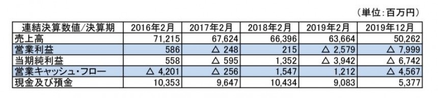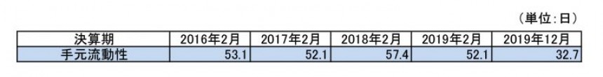 また、キャッシュ(現金及び預金)が急激に減少しています。2019年2月期では100億円前後(手元流動性は50~60日程度)でしたが、2019年12月期では一気に53億円(手元流動性は30日程度)まで減少しています。しかも、キャッシュの内約20億円は短期借入金等の担保に供されており、財務制限条項に抵触した借入金が約6億円ある等、実質的な手元流動性はさらに悪化していると考えられます。
