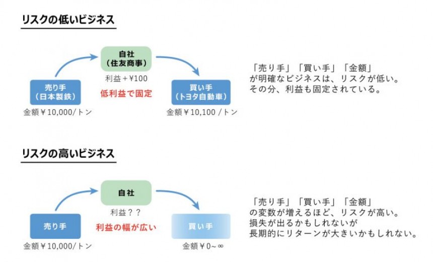 例えば、住友商事が日本製鉄から自動車用の鋼板をトンあたり10,000円で購入し、トヨタ自動車に10,100円で納入する取引はこの典型だろう。「誰からいくらで購入し、誰に対していくらで販売するのかが明確」という意味では、ほぼリスクは皆無と言えよう。加えて、この商材の売り手も買い手も日本はおろか世界を代表する企業であり、安心して取引を行う事ができる。