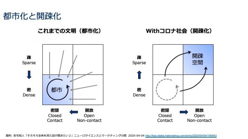 の4つの方向性を当面、所与として活動していかなければならないと考えられます。この内、2と3はかなり束ねることができますので、「開放×疎」に向かう、すなわち「開疎化」というかなり強いトレンドが生まれるというのが僕の見立てです。(参考:安宅和人「開疎化がもたらす未来」)