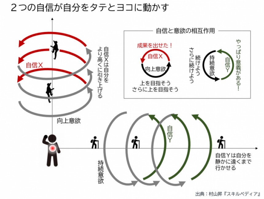 自信は意欲と相互作用があります。例えば、何か課題に取り組み、見事にそれをクリアして成果が出せたとき、自信Xが生まれますが、この自信Xはさらに上を目指そうという意欲を湧かせます。また、何か課題に取り組み、そこに献身する意義を見出したとき、自信Yが生まれますが、この自信Yはさらに持続しようという意欲を湧かせます。