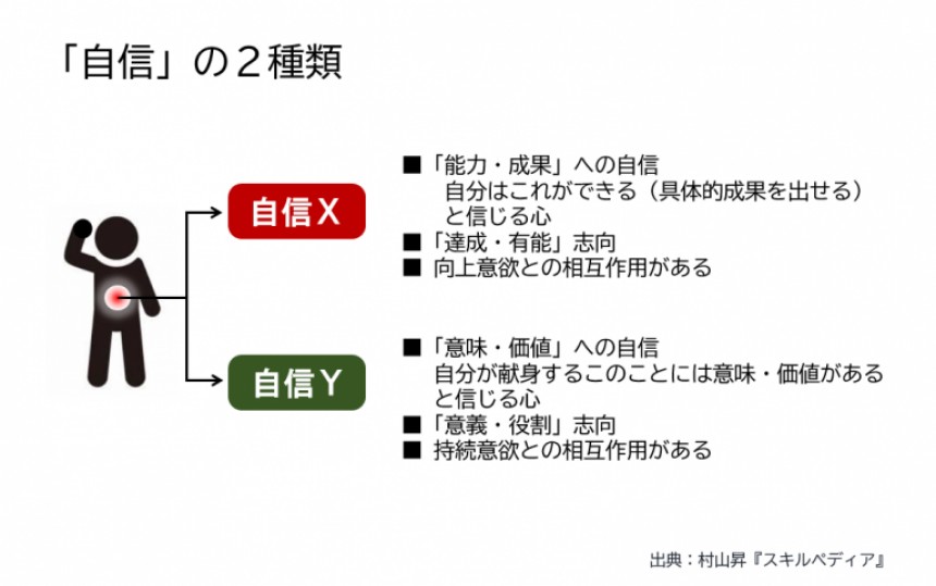 自信Xは「有能さ」をベースにするものであり、そこからは「長けた仕事」が生み出されます。他方、自信Yは「意味」をベースにしており、そこからは「豊かな仕事」が生み出されます。