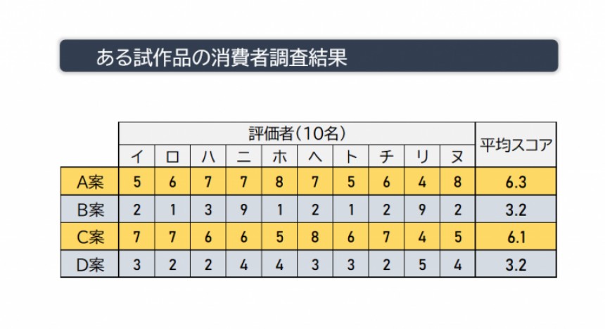 例えば、ある試作品4点を消費者調査にかけたとします。10人に10点満点(0点:全く買わない~10点:絶対買う)で採点してもらった結果が下表です。あなたが担当者なら、どの案がよいと思うでしょう?
