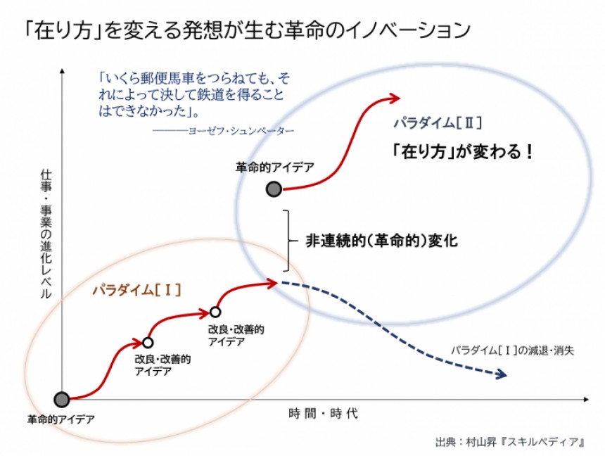 私たちは日々、仕事・事業の進化に努め、アイデアを出します。それを2種類に分けるとすれば、1つは「改良的アイデア」、もう1つは「革命的アイデア」が考えられます。