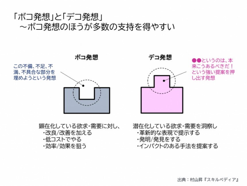また、消費者は自分の中ですでに顕在化している欲求、すなわち不備や不満を埋めてくれることにお金を払いやすくなります。ですから、商品のつくり手は改良的なアイデアによる「ボコ的発想」に集中します。