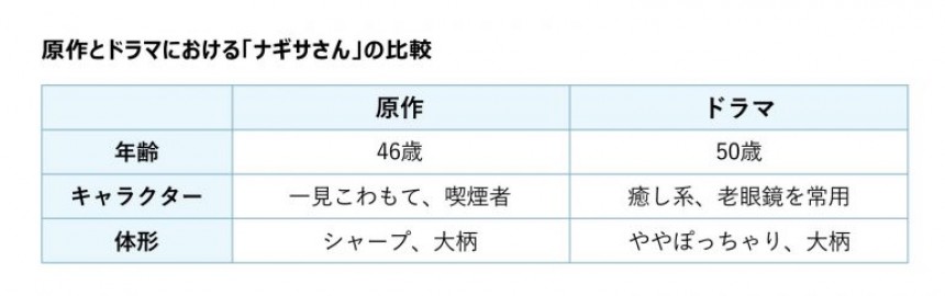 このように、原作では2人が恋愛に至る過程に違和感がありません。そのため、私も結末をすんなり受け入れやすかったです。しかし、ドラマのナギサさんは違います。癒し系のキャラクターで、老眼鏡を手放さず、少しお腹も出ていて、オシャレにも気を遣わず(不潔ではない)、限りなく父親に近い感じのおじさんです。