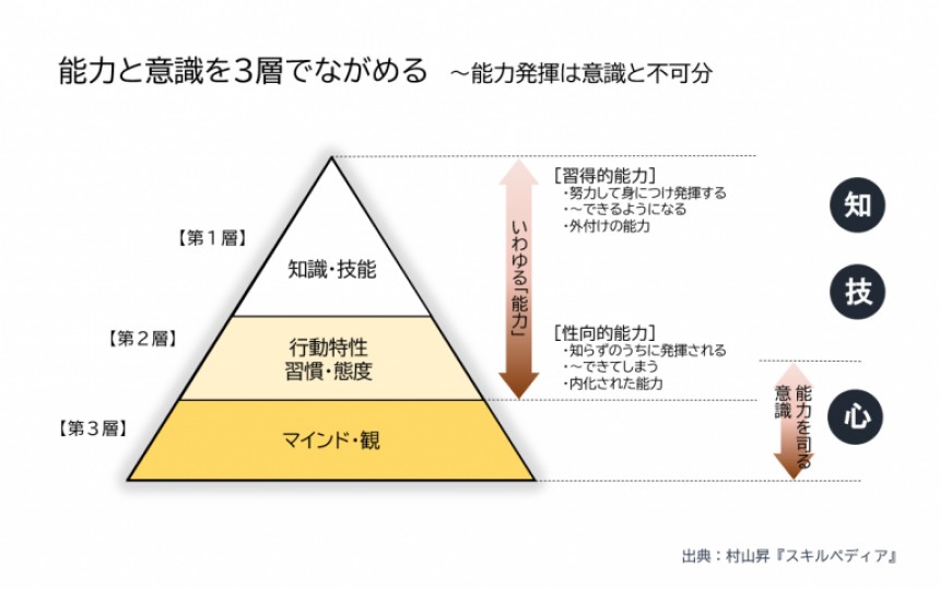 さてその3層図ですが、これは能力発揮と意識が不可分であり、3層で地続きであることを示したものです。第1層と第2層は、いわゆる能力層です。しかし第1層が習得的であるのに対し、第2層に下りていくにしたがい性向的なものになっていきます。言い換えると、部品的に外付けする能力と、自分の特性として内化していく能力との違いです。