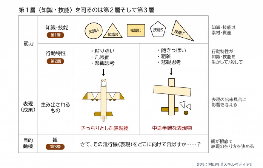 第1層の知識・技能はあくまで素材部品です。それをどんな具合に組み合わせ、成果物に仕上げるかは第2層の行動特性が握っています。外付けで持つ習得的能力は、内化された性向的能力の支配下に置かれるといってもよいでしょう。