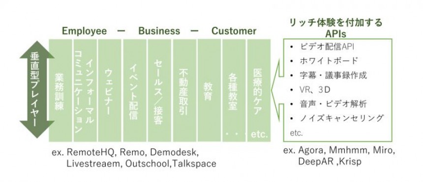 警戒が必要なのは「垂直型サービス」です。間隙を突くかのように、特定業務・利用シーンの体験価値を高めたビデオソリューションや、リッチなビデオ体験を付加するAPIなどで勝負するスタートアップが続々と誕生しています。