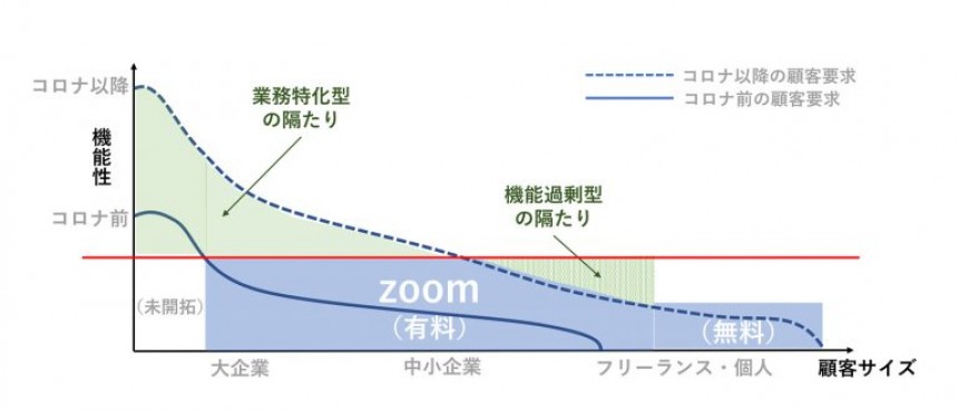 下図は、汎用的なZoom機能と顧客の求める機能性との間に生じつつある隔たりをイメージしたものです。