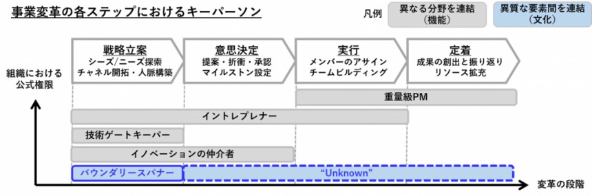 このような個人の役割としては、バウンダリースパナーの他にも様々な研究がなされており、「重量級PM」「イントレプレナー」「技術ゲートキーパー」「イノベーションの仲介者」といった役割が提唱されています。しかしながら、公式権限の低いミドル・ボトム層が事業変革を実現するために、どのような行動を取って難所を乗り越えていくのか、どういった要件を満たしているのかについては明らかになっていません(下図の“Unknown”の部分)。