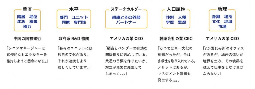 では、境界にはどのような種類があるのでしょうか。ここでは、クリス・アーンストらによる著書『組織の壁を越える――「バウンダリー・スパニング」6つの実践』(英治出版)による境界の5分類をご紹介します。