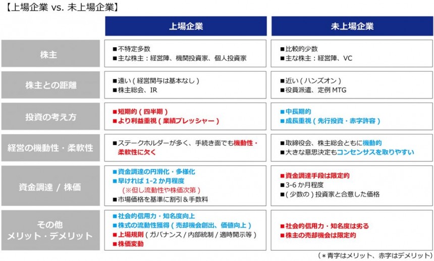 その裏返しで、未上場でいることのメリットとしては、比較的少数の株主の理解・支援があれば機動的な経営や先行投資による赤字も許容され、腰を据えて中長期目線でより大きな事業成長を目指すことが可能になることです。もちろん上場企業と比較したときに社会的な信用力が劣る(取引先、顧客、従業員など)面は否めませんが、大型調達できるくらいの規模感や成長性があれば、そこも一定程度補えるかと思います。