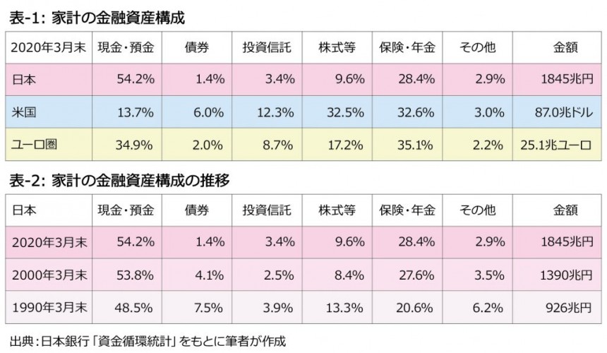 家計部門の金融資産の中身ですが、2020年3月末の状況(表-1)をみると、現金・預金が54.2%、債券・投資信託・株式等の有価証券が14.4%、保険・年金が28.4%と、現金・預金が過半数を占めています。一方、同時期の米国では、現金・預金が13.7%、有価証券が50.8%、保険・年金が32.6%と、反対に有価証券が過半数を占めており、特に株式等の比率が高いのが特徴的です。ユーロ圏では、それぞれ34.9%、27.9%、35.1%と米国と日本の中間といった状況です。