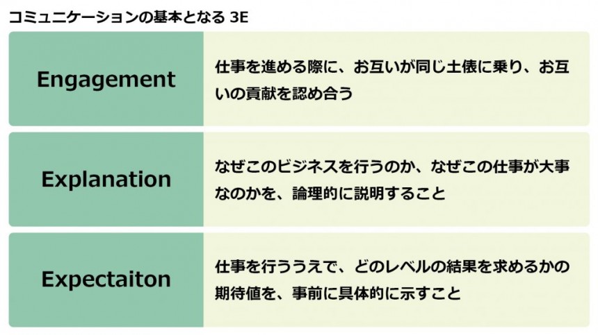 2つ目の説明の徹底(Explanation)は、まさに文字通りの意味だ。「なぜこのビジネスを行うのか」「なぜこの仕事が大事なのか」といったことを、論理的に丁寧に説明するということだ。一見、当たり前で簡単そうに見えるが、それ相応の準備と知識が必要になる。