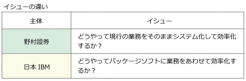 そもそも何がプロジェクトの破綻に効いていたのか、裁判所の判断も分かれるように、主因を特定することは難しい。ただ、そもそもの問題の発端はイシュー(答えるべき問い)の設定が同床異夢だったことにつきるのではないだろうか。両者のイシュー設定を思いっきり単純化すると…