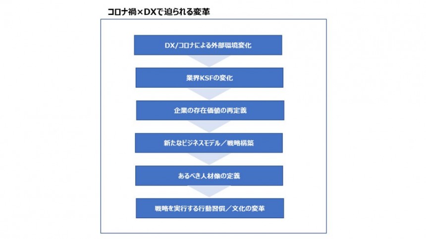 DX/コロナによる大きな変化により、業界のKSFの変化→企業の存在価値の再定義→新たなビジネスモデル/戦略構築→あるべき人材像の定義(スキル/価値観)→戦略を実現する行動習慣/文化の変革(そのための評価制度など)という変革の連鎖をどこの企業も迫られている。