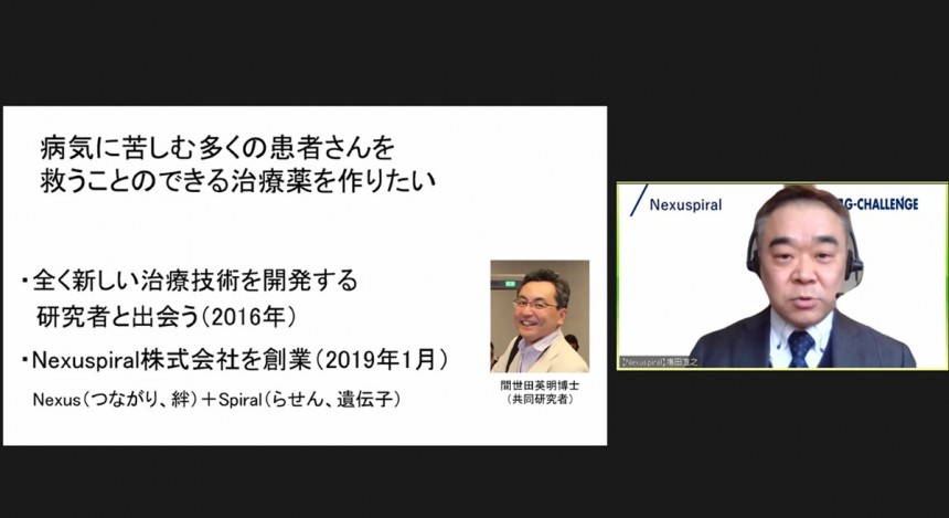 Nexuspiral株式会社はアカデミアで開発された核酸のみを用いてゲノム編集を行う技術(PODiRシステム)の実用化を目指し設立したベンチャーです。共同研究者の間世田英明博士の研究成果を2015年に特許出願し、本技術の実用化開発を推進するため2019年1月にNexuspiral株式会社を設立しました。