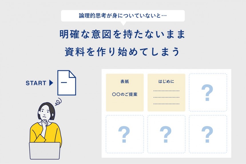 論理的思考が身に付いていない人は、「誰に」「何を」「どのような順番」で伝えるのが適切なのか、思いつきや直感だけに頼ってしまい、明確な意図のないまま資料作成をスタートしてしまうのです。 その結果、「ほかにどのようなページが必要なのだろう?」「このメッセージに説得力はあるのだろうか?」「これらの根拠で十分なのだろうか?」などと、悩み続けてしまい時間切れとなってしまったり、何とか資料を作り上げたものの、上司や取引先の理解、納得を得ることができなかったりと、成果を得ることができません。