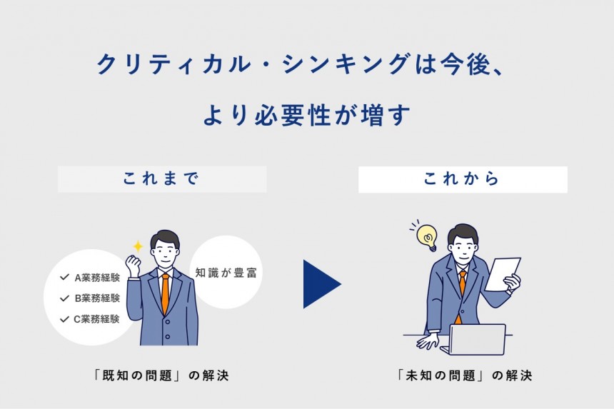 しかし、私たちは今、環境変化の予測が難しい「VUCA時代」を生きています。これまで直面したことがない「未知の問題」が増えると同時に、経験と知識さえあれば解決できたはずの「既知の問題」の割合が急激に減少しています。「未知の問題」に対処するには、経験や知識に頼らず、ゼロベースかつ客観的な視点を意識しながら、論理的に自分の頭で考え抜く力=クリティカル・シンキングが必要なのです。