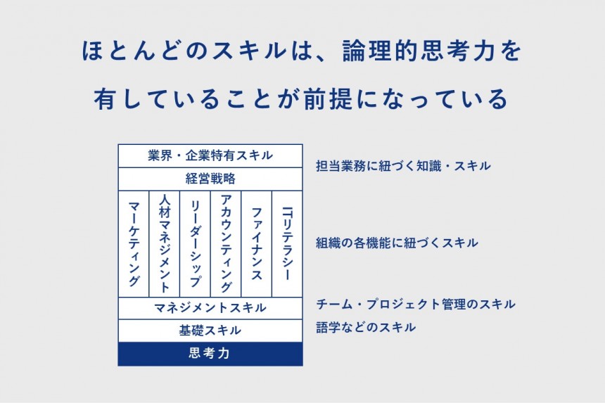 加えて、皆さんに認識していただきたいのは、論理的思考を身に付けると、ほかのスキルをビジネスに活かせる可能性が飛躍的に高まるということです。世の中に存在するほとんどのスキルは、論理的思考のスキルを有していることを前提としているからです。 言い方を変えれば、論理的思考力がないまま、さまざまなスキルを身に付けても宝の持ち腐れになる可能性が高いのです。