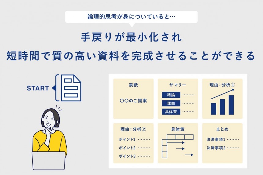 論理的思考が身に付いている人は、すぐにプレゼンテーションソフトを立ち上げるようなことはしません。まず、プレゼンの聞き手が関心を持つであろう論点(答えるべき「問い」)を洗いだし、次にそれらの「問い」の「答え(主張と根拠)」を言語化し、最後にそれらをどのような順番で並べるのか、相手の関心の高さに応じて並び替えるという一連の作業を先に行います。その結果、手戻りが最少化され、短時間で質の高い資料を完成させることができるのです。