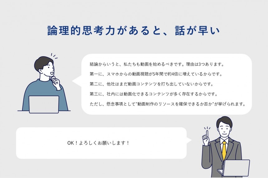 「結論から言うと、私たちも動画を始めるべきです。理由は3つあります。第一に、スマホからの動画視聴者は5年間で約4倍に増えているからです。第二に、競合はまだ動画コンテンツを打ちだしていないからです。第三に、社内には動画化できるコンテンツが多く存在するからです。ただし、懸念事項として”動画制作のリソースを継続的に確保できるか”があげられます。この点を今週末までに検討し、ご報告します」