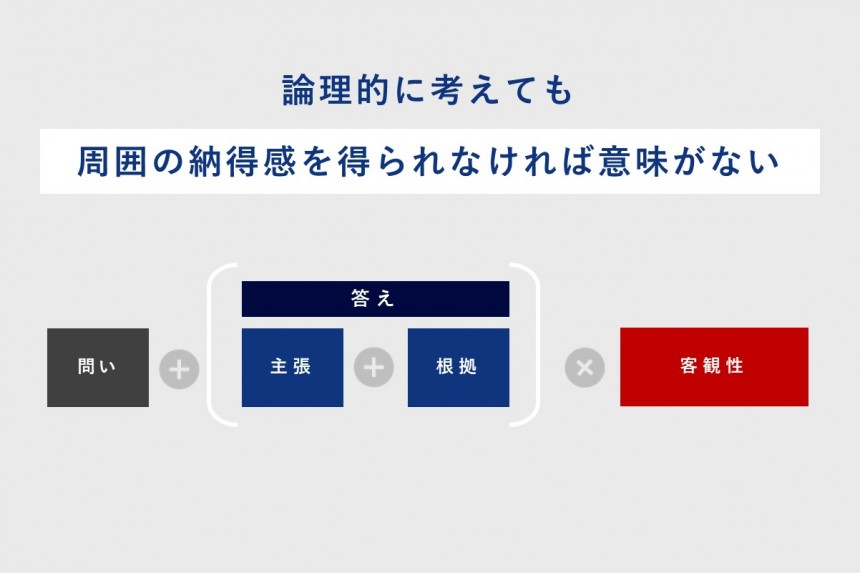 論理的に考える手法に沿って考えたとしても、客観性が担保できているわけではないのです。自分の考えを周囲に伝えた上で、理解してもらい、あなたが望んでいる行動を実際にとってもらうことまで考える必要があるのです。