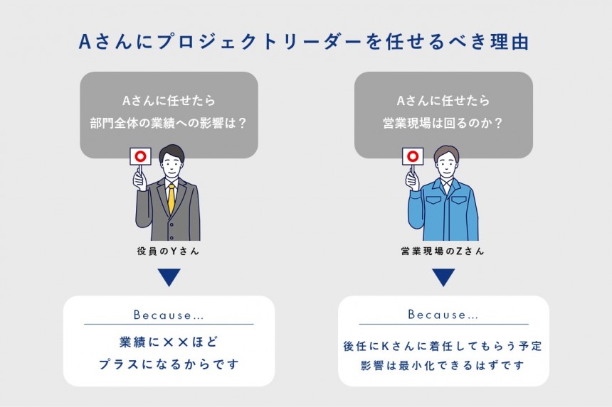 まずYさんは、Aさんだけに関心があるわけではない点を考慮する必要があります。担当役員であるZさんはあなたのチームだけでなく、担当部門内の全社員の人事について日頃から思考を巡らせているでしょうし、公平性の観点から、Aさん以外のプロジェクトリーダー候補者と比較してどうなのか、という観点も重視するでしょう。また、中長期的な全社戦略や事業戦略、人材育成戦略に沿っているのか、なども考慮しながら部門全体の業績への影響を考え、判断するでしょう。