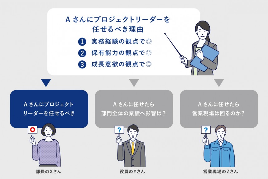 Aさんのことをよく知っていて、Aさんのことをほかの誰よりも高く評価している直属の上長である部長Xさんは、この説明で納得してくれるかもしれません。しかし、所属部門の担当役員であるYさんや営業現場のZさんも納得させることができるでしょうか。また、Aさんと同じチームのメンバーや今後、協業するプロジェクトメンバーの納得感がなければ、プロジェクトリーダーを任せた後のAさんやAさんを取り巻くメンバーのパフォーマンスにも影響を与えるでしょう。つまり、あなたにとって都合のよい(主観的な)内容で説明しても、周囲の納得感を得られない可能性があるのです。