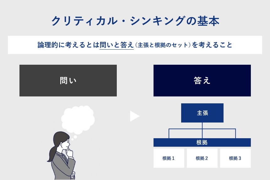 「論理的に考えるとは?」という質問に、あえて一言で答えるなら、「問いと答え(=主張と根拠のセット)を考えること」になるでしょう。