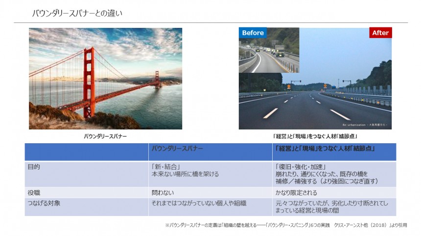 ここまで、結節点人材が経営と現場の相互理解を促進するということを見てきた。結節点人材は、「結節する=つなぐ」という意味合いから、組織の境界を架橋しイノベーションを加速するバウンダリースパナーという役割と類似するため、両者の違いを明確にしておきたい。