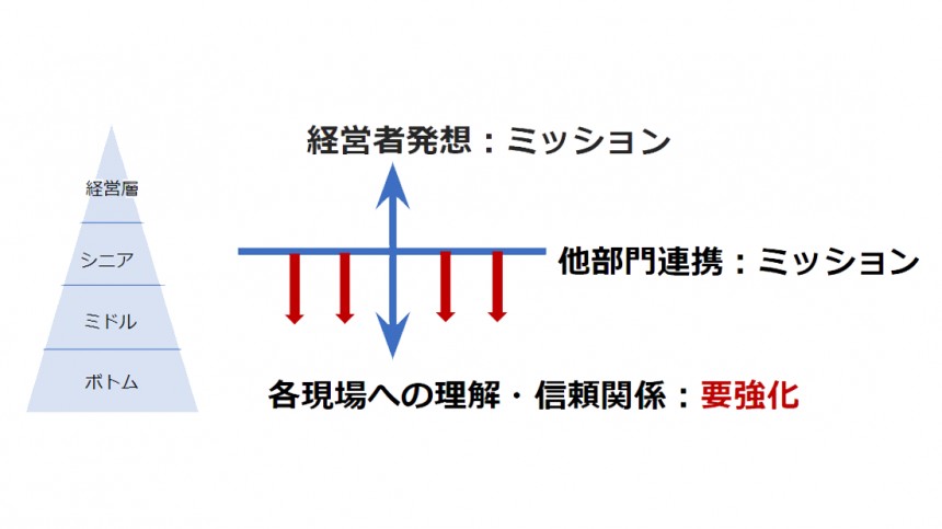 ただし現場の実際の困りごとや、オペレーションなどについては情報が乏しく、各部門の実情などへの理解・部門からの信頼がどれだけ高いかが結節点人材として輝くためのポイントである。