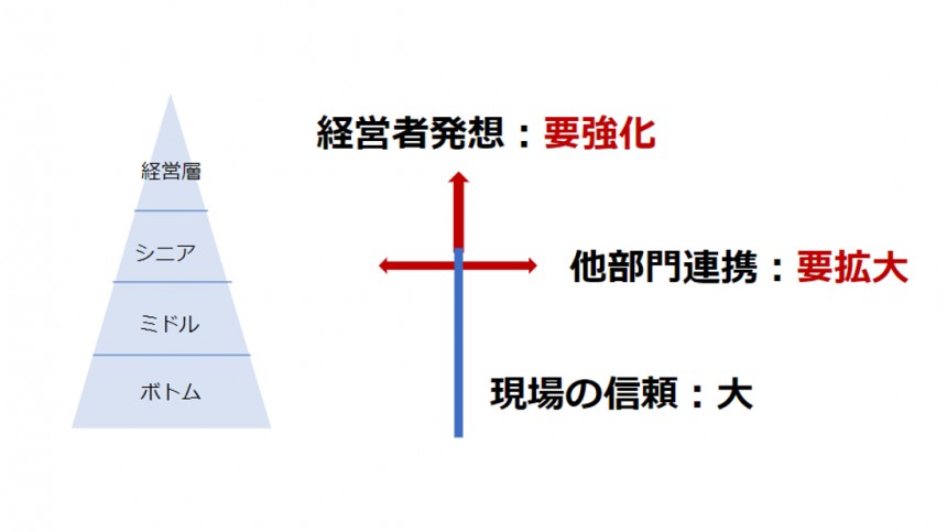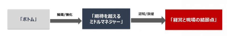 この3要素を獲得・強化することで信頼や実績が出来、周りに存在を認知されることとなる。それが土台となり経営と現場の結節点となるポジションに抜擢されるようになっていく。