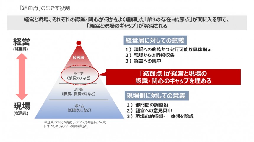 これまでに解説してきたように、“結節点人材”は経営と現場をつなぎギャップを埋める役割を担っている。