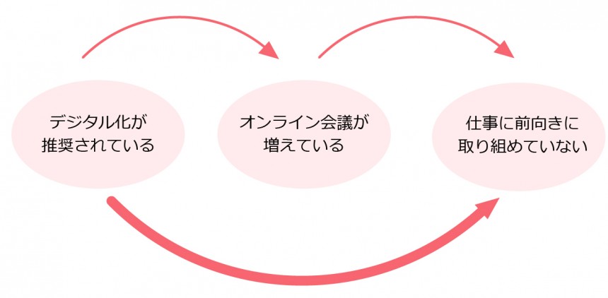 考えられる可能性のひとつは、図1のように、デジタル化が推奨された結果、オンラインでの会議が増え、その結果、仕事に前向きに取り組めていないというものです。3つの事象が順番に起こっていると考えることができそうです。