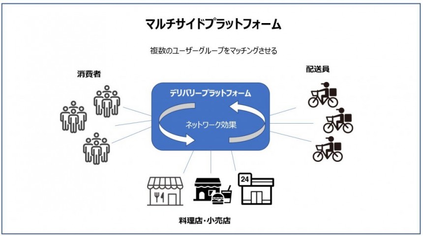 デリバリープラットフォームでは、モノを届けたいユーザーグループ(料理店や小売店)と、空いている時間を使い報酬を得たいユーザーグループ(配送員)、そして、配達してほしいユーザーグループ(消費者)の3つのグループをマッチングさせていることになります。このプラットフォームが価値を高めるために、それぞれのユーザーグループを囲い込むこと、また、マッチングの精度を上げることが重要になります。