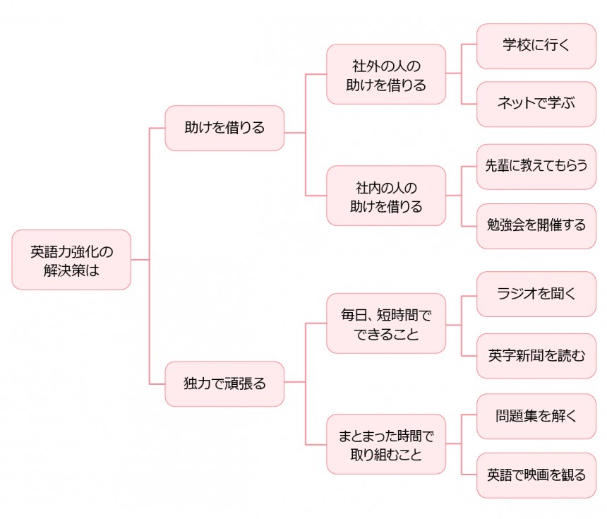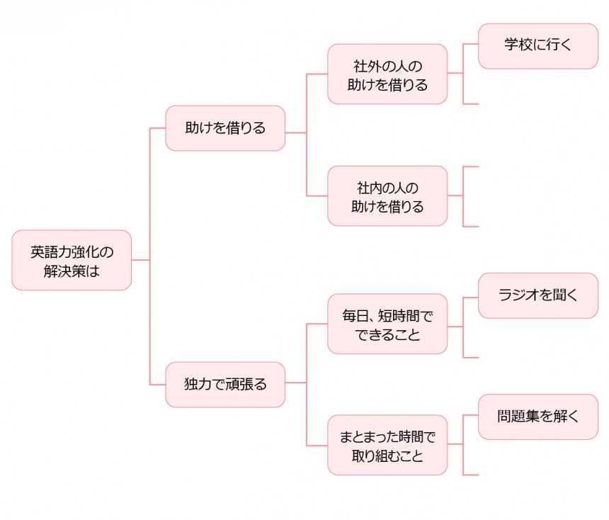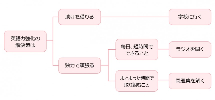 学校に行く、ラジオを聞く、問題集を解く、いくつかアイディアは出てきましたが、洗い出せている自信がありません。他にもっといい案があるような気もします。そこで思いついたアイディアを整理してみることにしました。