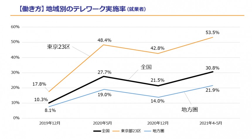 テレワーク導入が進んだ2020年春からすでに1年半ほど経過し、テレワークを継続してきた人にとっては、いつの間にかテレワークが日常に定着していったのでしょう。