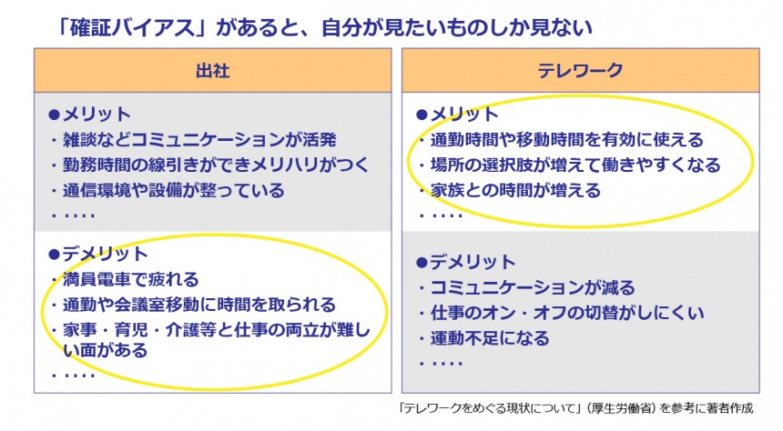 テレワークが望ましいと思う方は、テレワークのメリットと、出社形式のデメリットがパッと頭に浮かび、それらを述べたニュース記事や他の人の意見が思い出しやすかったのではないでしょうか?反対に、出社形式が望ましいと思う方は、出社のメリットと、テレワークのデメリットがパッと頭に浮かべたのではないでしょうか?