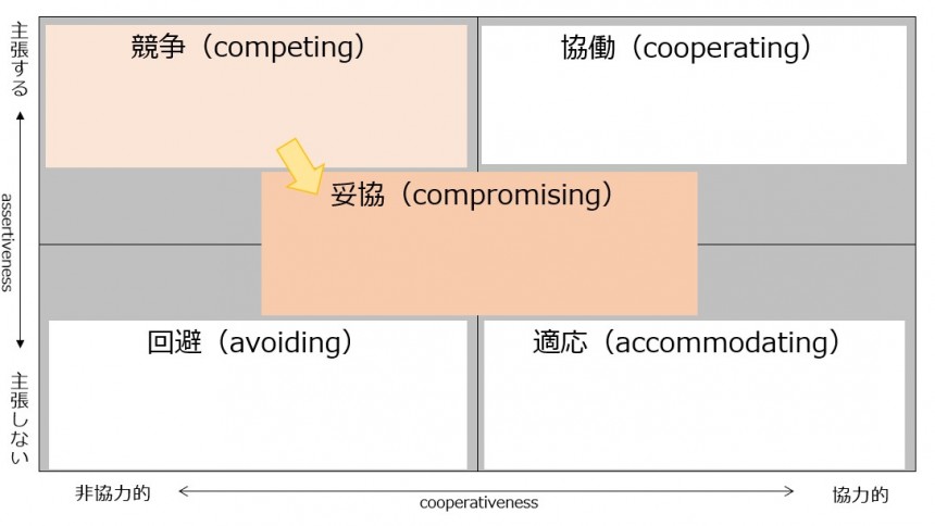 一つには、前回の正論一辺倒の「競争」モードから、大目的を常に意識しながら、あるべき姿に少しでも近づくための「妥協」モードを選択できたこと。これによりコンフリクトスタイルの幅が広がった。