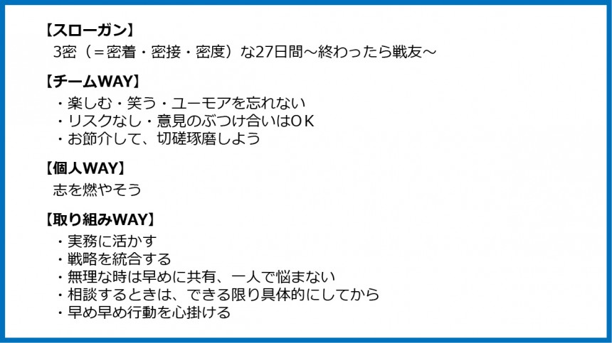 メンバーが集まった時期も早ければ、動きも早かった。5月下旬にはキックオフミーティングを実施。当初、チームの目標を、「予選突破」と掲げた。加えて、チームのスローガンやチームWAY・取り組みWAY・個人WAYなどを決めるべく、何度かミーティングを繰り返した。(決定事項は以下)