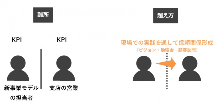 大手医薬品メーカの営業企画担当者のYさんは、規制緩和をきっかけに事業成長を図る新たな事業モデルの構築を推進していました。実行するためには、各支店の営業部隊の協力を仰ぐ必要がありましたが、営業部隊は支店での売り上げをKPIとしており、過去の経験から積極的な協力は得られないことが予見されていました。そこで、Yさんは、各支店を行脚し、事業モデルの構築で成し遂げたビジョンを伝え回ると共に、実行に必要な知識・具体的な実行プロセスに関する勉強会を開催しました。また、依頼があれば、顧客に同行訪問する、販促資料作成を支援するといったことだけでなく、個々の営業部員の記念日を祝う、個人的な相談にも積極的に乗るなどして、信頼関係を構築していきました。その結果、営業部隊の6割が積極的に取り組みを進め、新たな事業モデルを構築することができました。