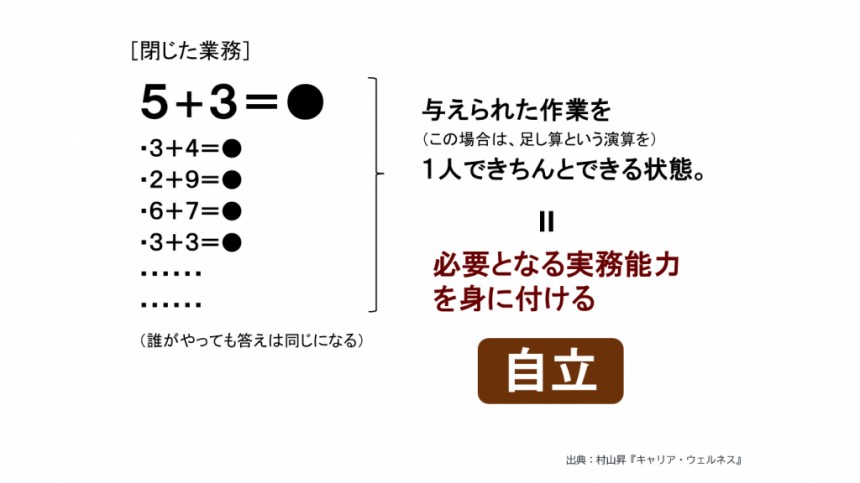 「5+3=●」的な閉じた業務というのは、足し算という技能さえ身につければ、後は決まった答えが出せるので比較的やさしいといえます。他方、「○+○=8」や「○+○=○」のように開いた業務は、決まり切った答えがないという意味で難しい。